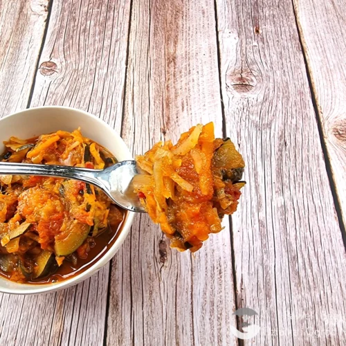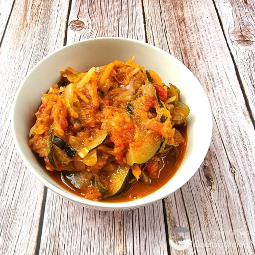W czasie smażenia przygotowujemy cukinię. Kroimy ją na mniejsze kawałki – w kostkę lub półplasterki. Jeżeli cukinia ma twardą skórkę to należy ją wcześniej obrać i pozbawić twardych nasion, młodej cukinii nie obieramy. Pokrojoną cukinię dodajemy do cebuli z czosnkiem i marchewką, wsypujemy sól, mieloną paprykę, pieprz, dokładamy liść laurowy i ziele angielskie. Całość mieszamy i nadal podsmażamy przez następne 10 minut mieszając co jakiś czas.