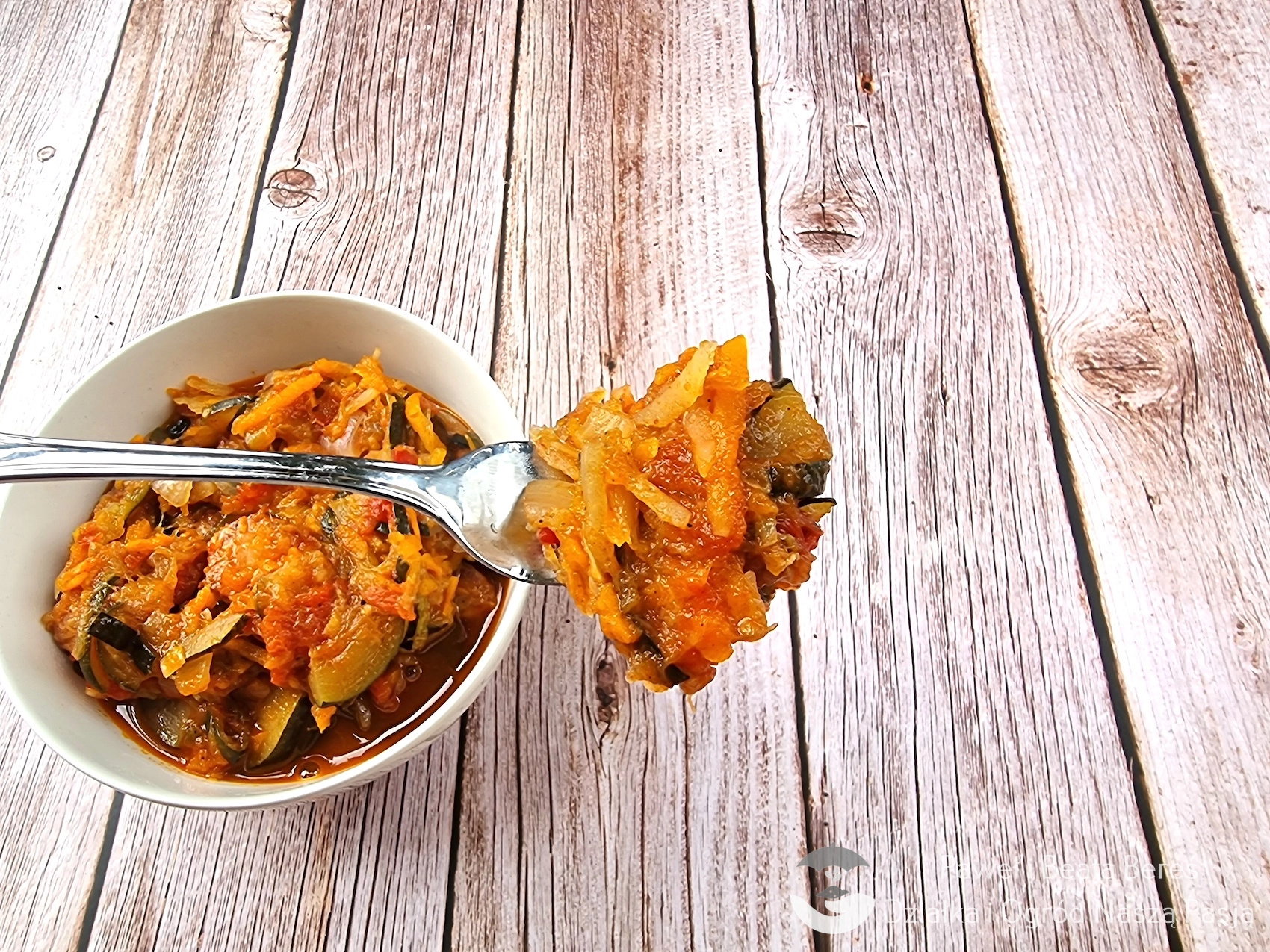 W czasie smażenia przygotowujemy cukinię. Kroimy ją na mniejsze kawałki – w kostkę lub półplasterki. Jeżeli cukinia ma twardą skórkę to należy ją wcześniej obrać i pozbawić twardych nasion, młodej cukinii nie obieramy. Pokrojoną cukinię dodajemy do cebuli z czosnkiem i marchewką, wsypujemy sól, mieloną paprykę, pieprz, dokładamy liść laurowy i ziele angielskie. Całość mieszamy i nadal podsmażamy przez następne 10 minut mieszając co jakiś czas.