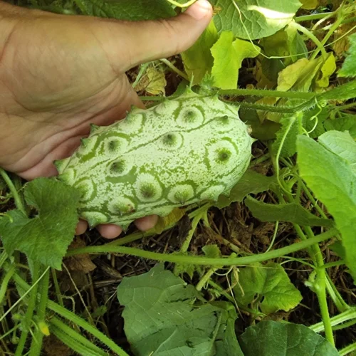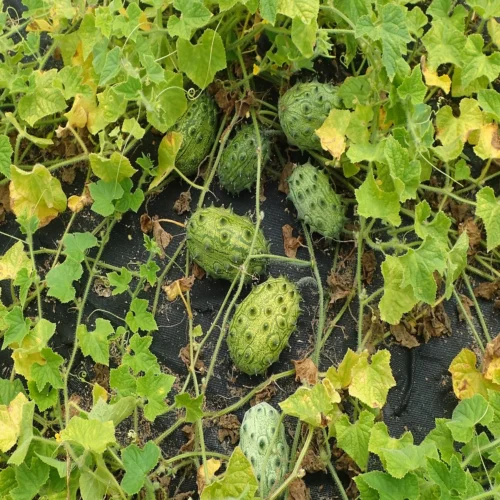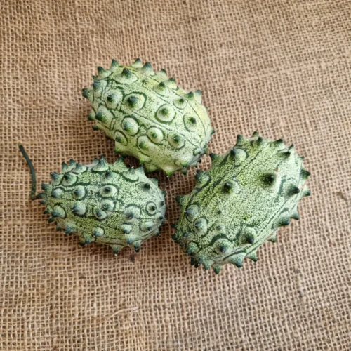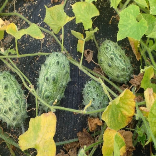 Pierwsze małe owoce spotyka się już od czerwca (lub wcześniej, gdy uprawa jest w ogrzewanej szklarni), niemniej pełną dojrzałość uzyskują zwykle od końca sierpnia, bądź od września. Owoce dojrzewają stopniowo. Z jednej rośliny uzyskać można od kilku do kilkunastu sztuk. Początkowo są zielonkawe, z charakterystyczną marmurkowatą strukturą, ale ostatecznie po dojrzeniu stają się pomarańczowe. Każdy owoc pokrywają wypustki, na końcu których znajdują się kolce. Największe owoce to te pierwsze jakie się zawiązały i mogą mieć do 10-15 cm długości, średnicę 6-10 cm i wagę do 200, a nawet 400 g.